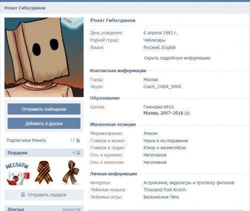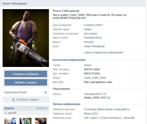 Как видим есть дата рождения "6 апреля 1999г." запоминаем, нам пригодится, а так же место учебы "Гимназия №16", тоже пригодится...