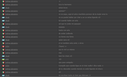 10. 23 joshua giovanny you brother crazy 22 Aisak are crazy 21 joshua oppressor giovanny * 20joshua giovanny not papu, here poresor macho woman only are you 19 Aisak can not speak for that and these ligand chat 18 Aisak lol when talking with aria 17 joshua giovanny so you fuck my papupan 16 Aisak hahaha 15 joshua giovanny up with aria 14 giovanny joshua walk fucking 13 joshua giovanny already have that reputation 12 Aisak who will 11 giovanny joshua if not also the emir, and other 10 XJDX (Team): v 9 giovanny joshua myself that I live 8joshua giovanny nop 7 Aisak read chats 6 emir! D3 5 giovanny joshua happened friend 4 XJDX quiet when leagues in chat nobody tells you anything: v 3 joshua giovanny ah yes, at least I'm not neglect ligand 2 joshua giovanny 1 Aisak not write both distracting chat: V 23Joshua giovanny your brother crazy 22 Aisak estan locos 21 joshua giovanny opresor* 20joshua giovanny no se papu, aqui el unico machista poresor de la mujer eres tu 19 Aisak no se puede hablar por chat que ya estas ligando 18 Aisak lol cuando hable con aria 17 joshua giovanny asi que te jodes mi papupan 16 Aisak jajajaja 15 joshua giovanny hasta con aria 14 joshua giovanny de andar jodiendo 13 joshua giovanny ya tienes esa fama 12 Aisak quien sera 11 joshua giovanny si no tambien esta emir, y otros 10 XJDX (Team) :v 9 joshua giovanny eso lo vivi yo mismo 8joshua giovanny nop 7 Aisak leen los chats 6 emir !d3 5 joshua giovanny que paso amiguito 4 XJDX tranquilo que cuando ligas en el chat nadie t dice nada :v 3 joshua giovanny ah si, descuida cuando menois no ando ligando mi shavo 2 joshua giovanny 1 Aisak no escriban tanto al chat que distraen :V