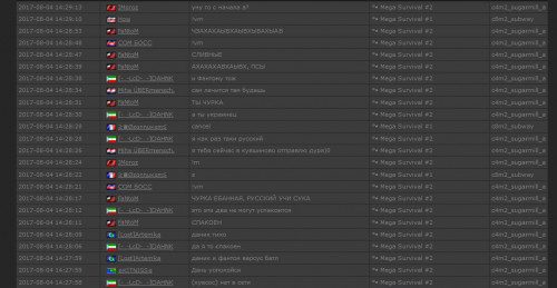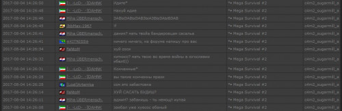 3. 1. ☆KITNISS☆ 2. FaNtoM ( STEAM_0:0:1269989436) и Miha ÜBERmensch. (STEAM_0:1:45593325) 3. 04.08.2017 4. Mega Survival #2 5. Мне написал игрок [-_-LcD-_-]DAHNK о том, что два других игрока оскорбляли его и его родню, (скриншоты были сделали на момент когда я пришла на сервер) Что происходило до моего прихода я не знаю, но эти неадекватные игроки успели и про меня написать, что видно на скринах. О подробностях спрашивайте у игрока [-_-LcD-_-]DAHNK т.к вскоре после того как я зашла на сервер они слились. P.S. Игрока FaNtoM я часто видела на сервере. 6. Свидетель СОМ БОСС