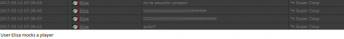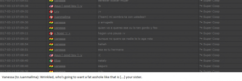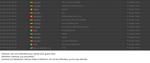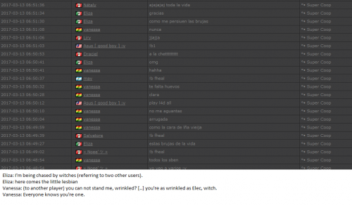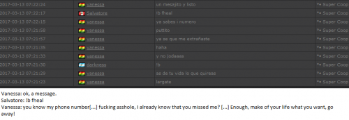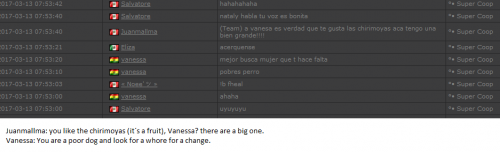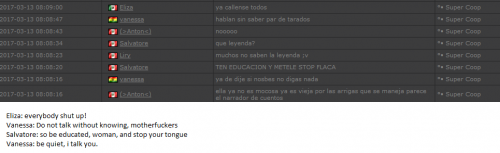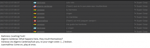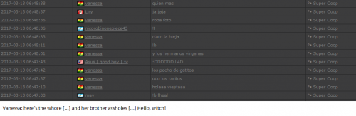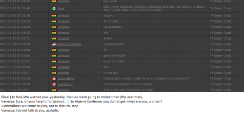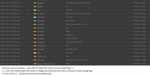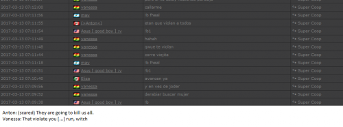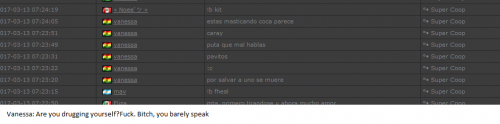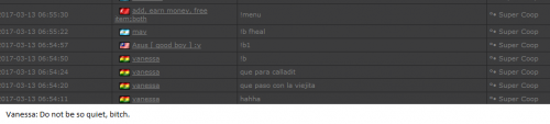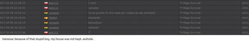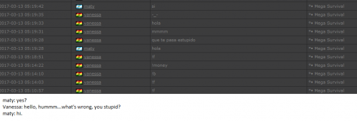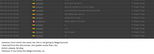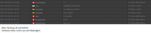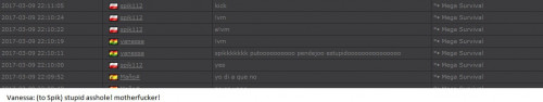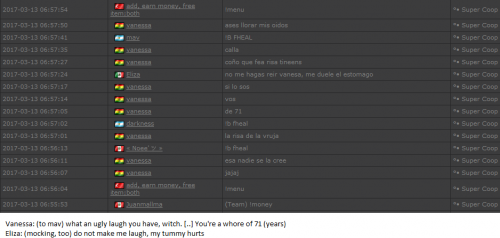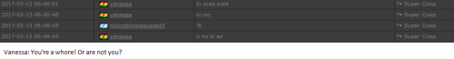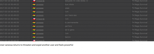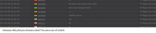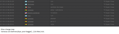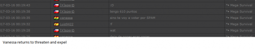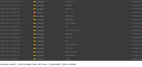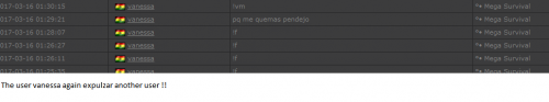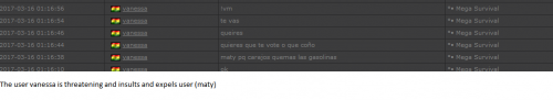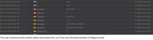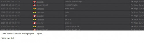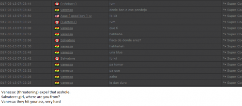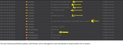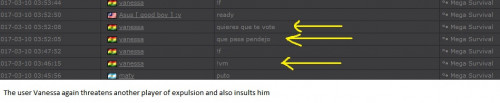 4. I'm making a complaint against a user named Vanessa. This user is abusive with other users, threatens, insults and humiliates any player, using their VIP status to act with impunity. My question is: can a VIP user have a privileged position to manage as an administrator? I send captures of the chat of other users and the user Mav, where the VIP user Vanessa insults him exclusively. First, the monday´s pictures. Second, the photos showing how Vanessa insults other players and threatens them with the expulsion. This Monday was the last: the user Eliza entered and asked Vanessa to start annoying the others. Then Vanessa humiliated and insulted everyone, not letting others play. The problem was so serious, that could not finish a game and several players left the server. The harassment was so severe that I could not take it any more and I was angry with her. I apologize for losing my patience that way. In addition, there were other players, like Eliza, who asked Vanessa to cause problems, mocking the situation, like Draciel and Liry. It tried to solve this with a vote, but could not be expelled to Vanessa, by its condition of VIP player. Mr. Administrator, you warned that you would not allow more outrages, can you do something with these players: Vanessa, Eliza, Draciel, Liry? They just entered the server to annoy everyone. Add more evidence that shows that user Vanessa always acts the same way and with other users and other servers. for a long time. And also that he continues to abuse his VIP status today.